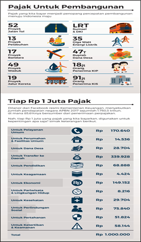 Sudahkah anda mengerti dan memahami kemana pajak itu dialokasikan? Apakah anda sudah mengetahui manfaat pajak dan keuntungan bayar pajak? Tidak ada salahnya anda mendukung pemerintah dalam menyukseskan setiap program pemerintah dengan cara membayar dan melaporkan pajak. Ingin menjadi orang bijak? Taatlah membayar pajak karena orang bijak taat pajak.